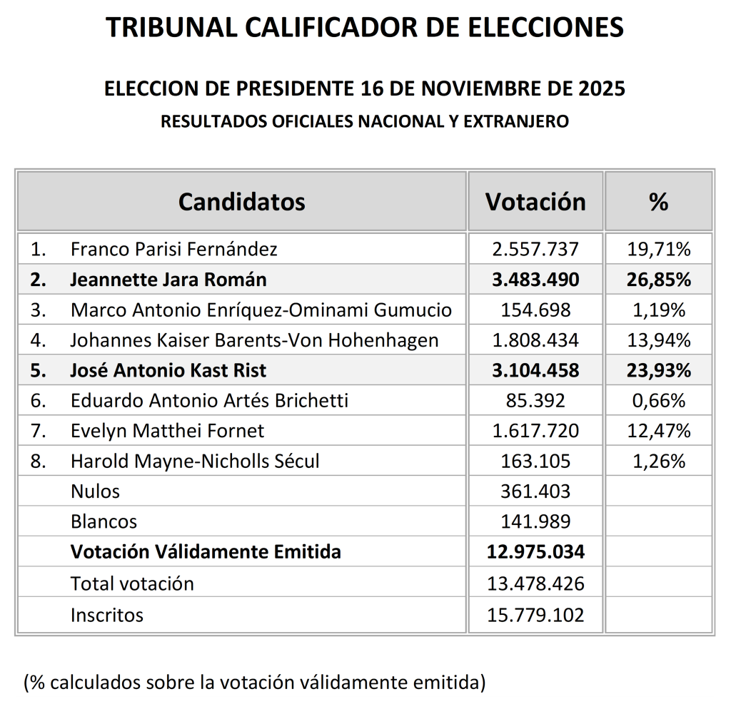 Los Resultados Oficiales (nacionales y extranjeros) de la Elección de Presidente de la República, de fecha 16 de noviembre de 2025, son los siguientes: